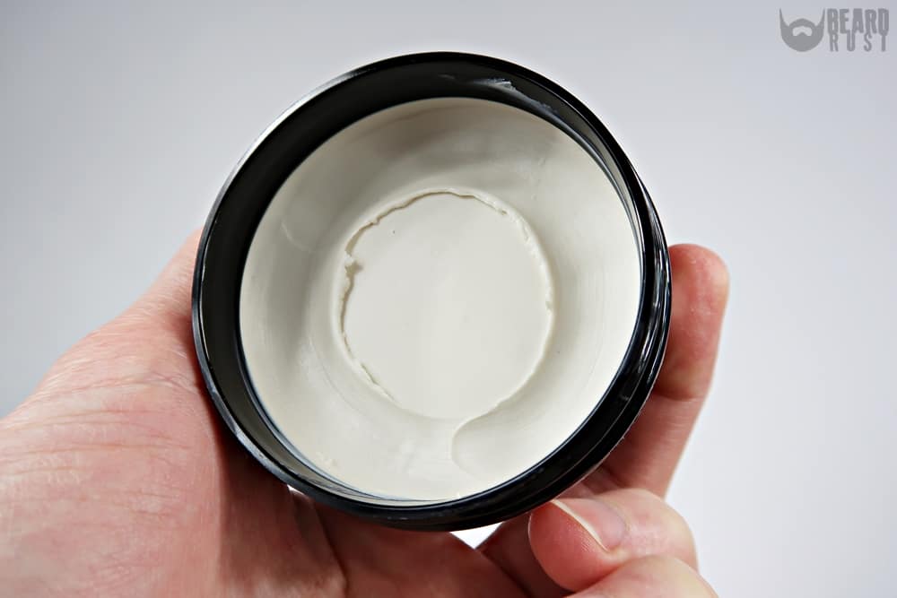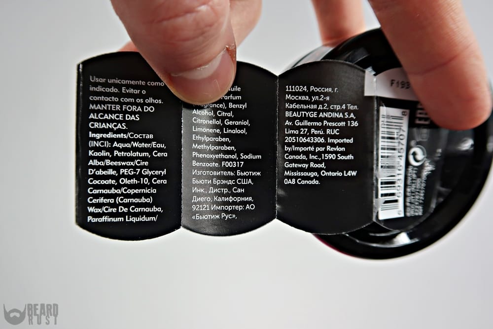 Jak widać mamy wodną bazę przez co pomada ładnie się zmywa. Obecna jest tez glinka kaolin, która matuje włosy oraz woski – pszczeli, karnauba – które nadają chwyt pomadzie.