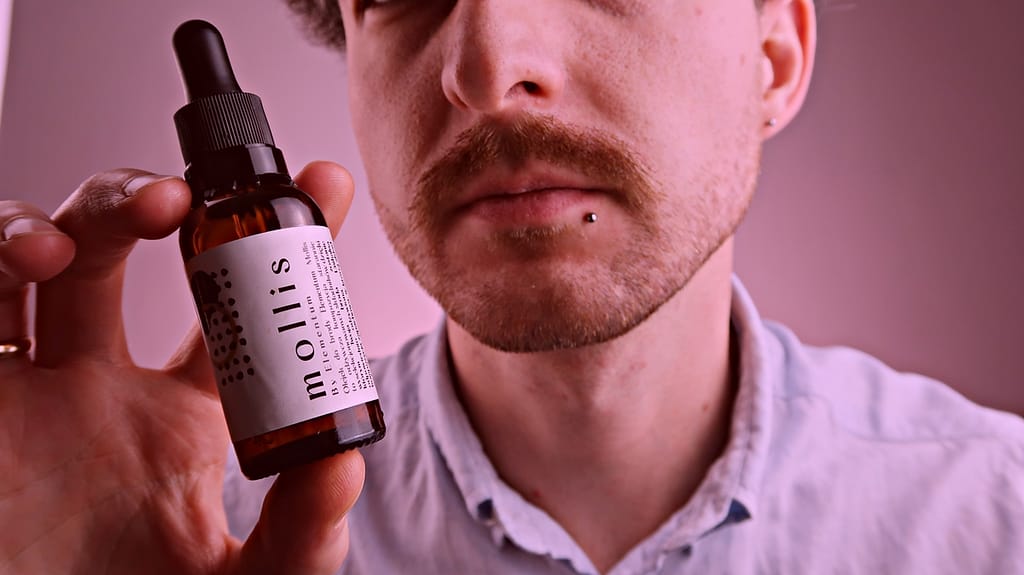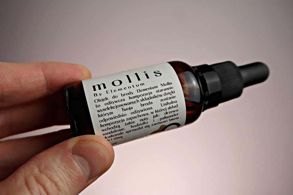 By Elementum Mollis to olejek do brody, którego zadaniem jest odżywić zarost/brodę oraz skórę. To unikalna kompozycja 6 wyselekcjonowanych olejków roślinnych – makadamia, ryżowy, awokado, arganowy, z ogórecznika i z zarodków pszenicy. Olejek znajduje się w szklanej butelce o pojemności 30 ml. Aplikujemy go pipetą. Produkt ma mocny słomkowy kolor, łatwo się rozciera i wmasowuje w brodę. Nie jest wyjątkowo tłusty i całkiem szybko się wchłania. Prócz właściwości odżywczych jest ostatnio moim ulubionych olejkiem pod względem zapachu. Znajdziemy tu nuty drzewno-orientalne np. aromat drzewa Amyrisowego, drzewo różane, sandałowe czy fasolę Tonka.