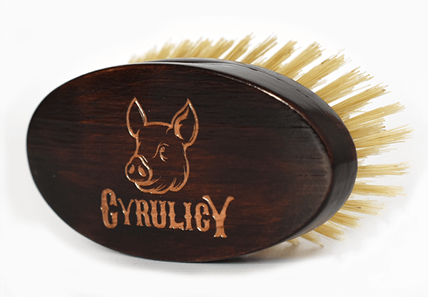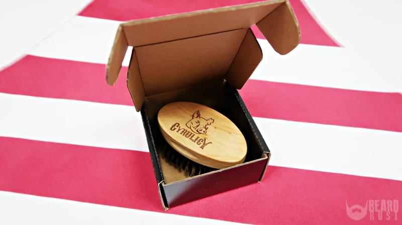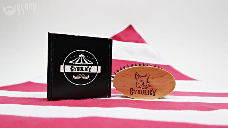 Dzik od Cyrulików mieści się z czarnym, kartonowym opakowaniu z logo marki. Kartacz wykonany jest ze szczeciny prawdziwego dzika (włosie z cebulkami). Włosie ma długość 2 cm, więc spokojnie dotrze do skóry nawet przy bujnej brodzie. Kartacz nie ma poduszki, a włosie nabijane jest ręcznie i należy do tych średnio gęstych. Trzon kartacza (element, za który go trzymamy) wykonany jest z lakierowanego drewna z sympatycznym grawerem w postaci głowy dzika. Po bokach znajdują się wgłębienia dla lepszej kontroli dzika.