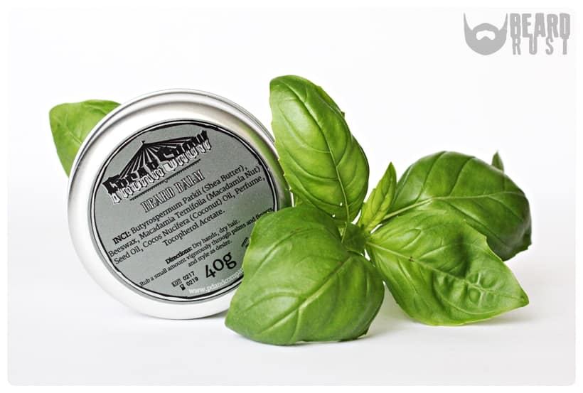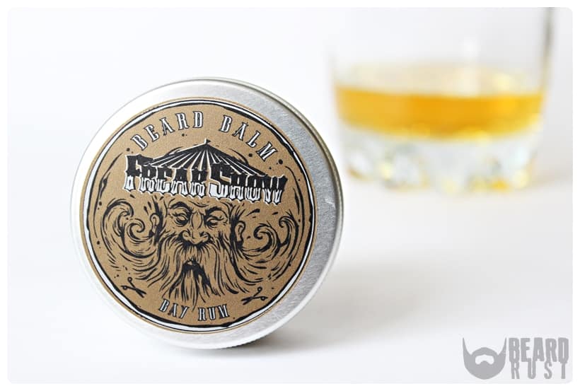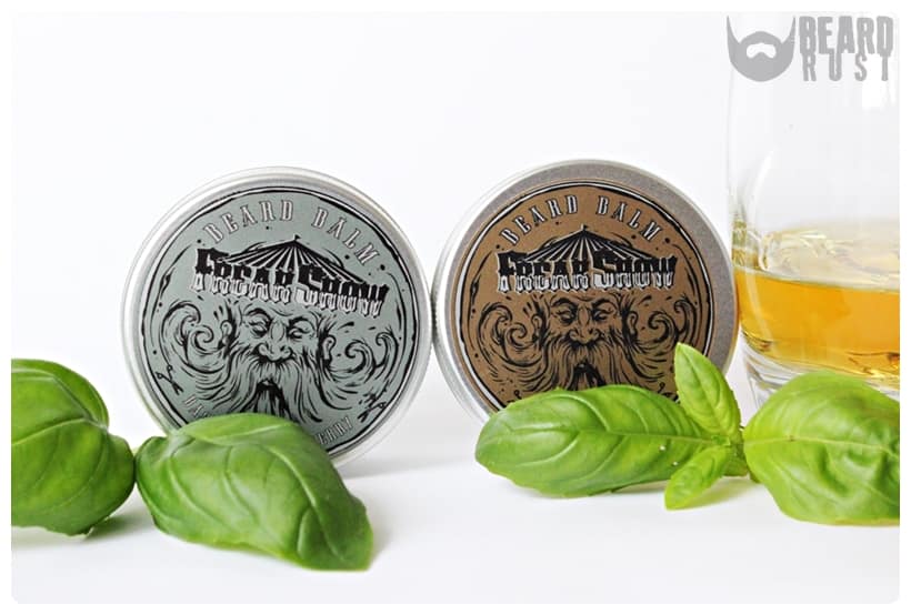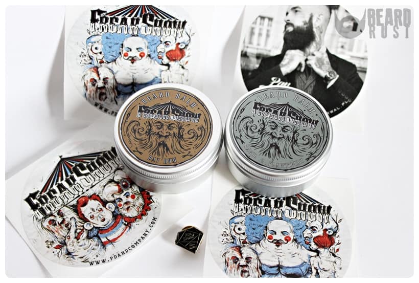 Oba balsamy znajdują się w aluminiowych puszkach, które przyozdobione są naklejkami – jedna na wieczku i jedna pod spodem opakowania. Naklejki są w kolorze brązowym/złotym i szarym/zielonkawym. Te na wieczku przedstawiają, jak to powiedziała Pati – bliźniaków. Są to brodacze z wywiniętymi na boki kosmykami brody. Nad ich głowami widnieje dumnie napis Freak Show i kopuła cyrkowa. Design bardzo ciekawy i fajne wpisujący się w klimat gabinetów osobliwości oraz barbershopów. Są tu też dwie pary małych nożyczek, między którymi znajdują się nazwy wersji zapachowych balsamów. Pod spodem puszki etykietka mówiąca o składzie, sposobie użycia produktów, gramaturze, dacie produkcji i terminie ważności.