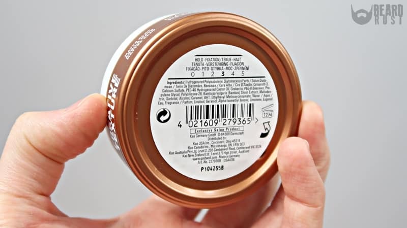 Bazą matowej glinki od Goldwell jest polimer, emolient suchy – uwodorniony poliizobuten, który jest substancją syntetyczną. Zaraz za nim w składzie naturalna ziemia okrzemkowa, wosk pszczeli, uwodorniony olej rycynowy, ozokeryt itd. W składzie znajdziemy też charakterystyczny dla serii StyleSign wyciąg z bambusa. Taka mieszanka wosków i suchych glinek sprawia, że produkt jest szorstki, matowy, ale jednocześnie plastyczny i pozwalający na swobodne modelowanie włosów.