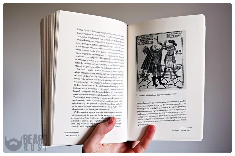Tekst nie jest pisany trudnym językiem, ale jego ton jest raczej poważny/formalny. Podawanie informacji nie jest jednak suche, a ubrane w ciekawy i soczysty sposób. W książce znajdziemy też kilka obrazków, są to głównie portrety królów, władców, bogów czy artystów itd. Moim zdaniem mogłoby być ich nieco więcej, bo pewne treści ładniej wyglądają w towarzystwie ilustracji. Poza tym dla mnie brodacza, książkę czytało się bardzo przyjemnie i byłem nieustannie zaciekawiony. Mimo, że pewne historie już znałem, znalazłem tu wiele nowych i ciekawych i fascynujących faktów. Jest to na pewno jedna, jeśli nie jedyna tak obszerna książka dotykająca w wielu aspektach tematu brody.