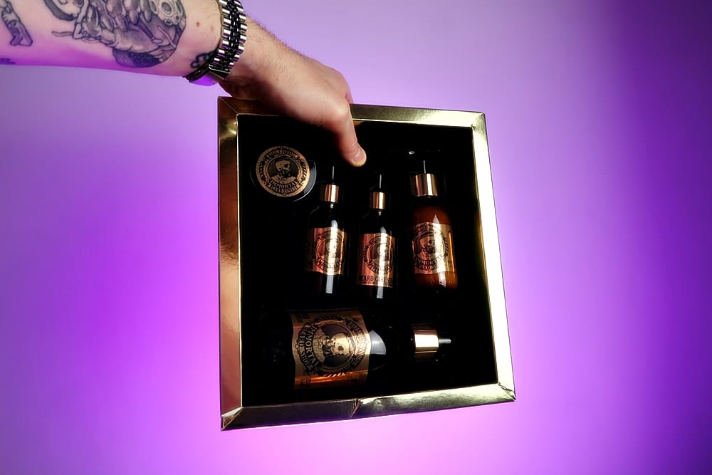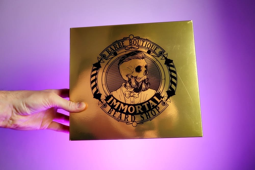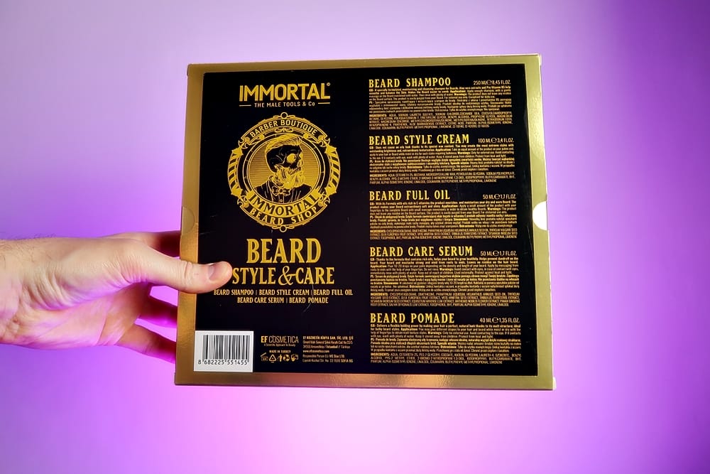 Tureckie marki kosmetyczne mają bardzo charakterystyczny styl opakowań. Używają zazwyczaj żywych kolorów, pojemniki są duże, mają bardzo wyraźne fonty, dominuje złoto, przepych i blichtr. Nie inaczej prezentują się kosmetyki do brody od Immortal. 5 in 1 set zapakowany jest w złoty karton z brodatym szkieletorem na froncie. W środku znajdziemy produkty ułożone zgrabnie w piankowej otoczce. Etykiety poszczególnych produktów również są złote, ładnie błyszczą w świetle i zawierają sporo informacji dla użytkownika. Butelki i słoiczki są szklane i wykonane bardzo solidnie, a etykiety nie powinny się ścierać. Osobiście wolę bardziej minimalistyczny styl ale nie da się ukryć że kosmetyki Immortal rzucają się w oczy.