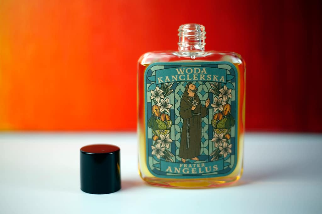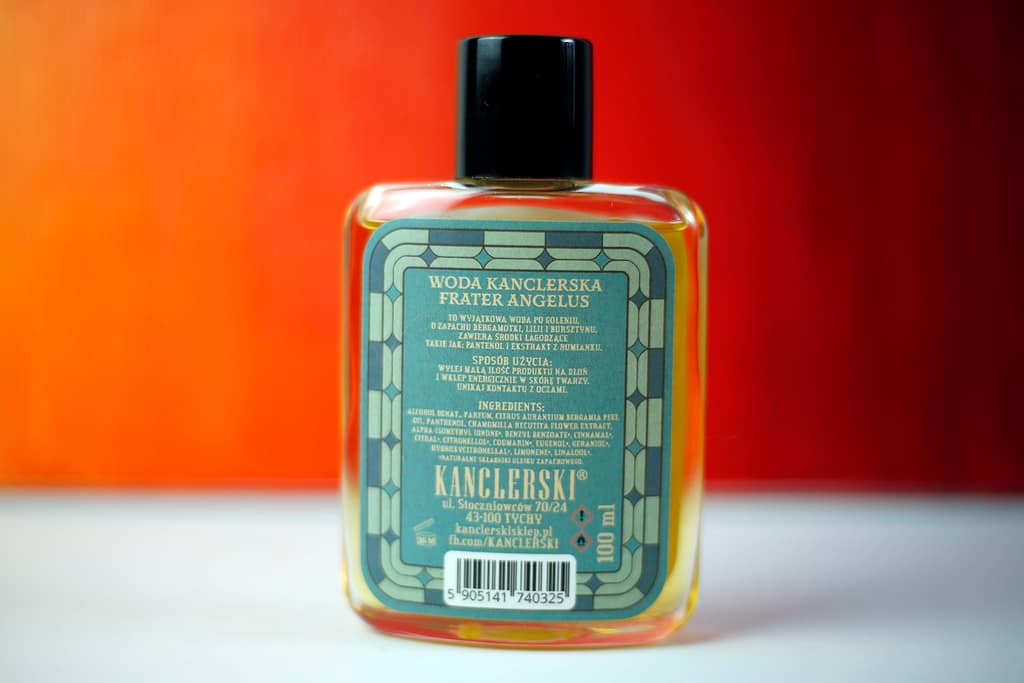 Woda po goleniu Kanclerskiego Frater Angelus to produkt przeznaczony dla amatorów i fanów golenia się głównie na gładko aczkolwiek jeśli ktoś z was podgala kontury brody to też zrobi z niej użytek. Woda ma żółtawy kolor i mieści się w szklanej wąskiej butelce o pojemności 100 ml. Butelkę zakręcamy czarnym plastikowym “korkiem”. Aplikacja następuje poprzez wylanie wody na dłoń. Nie ma tu żadnego psikadełka tylko dziurka w szyjce butelki.