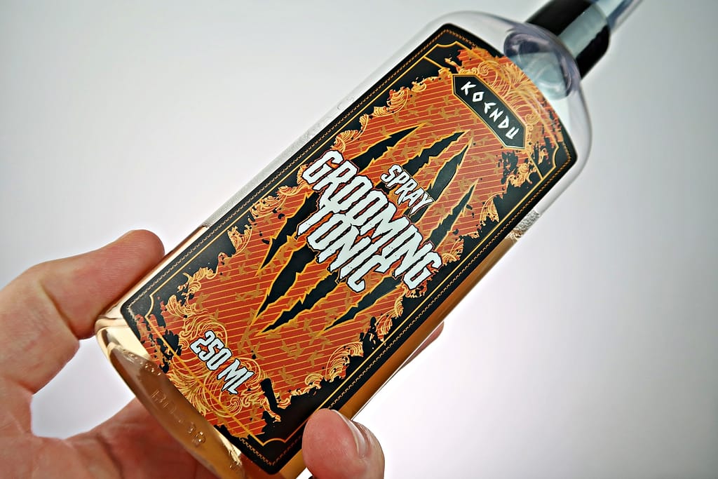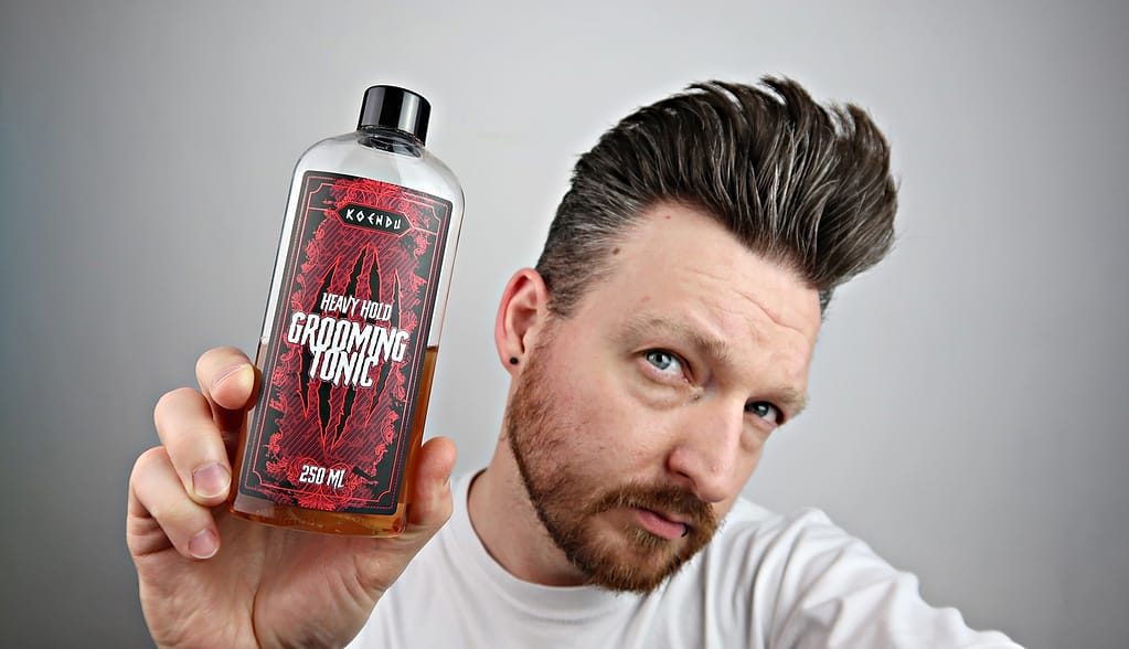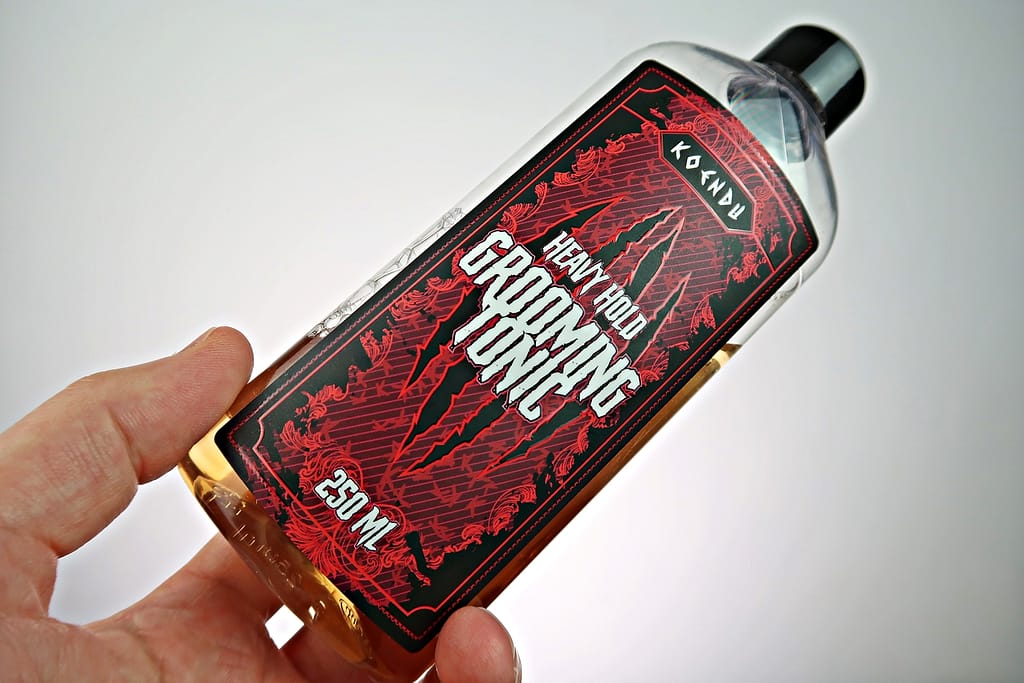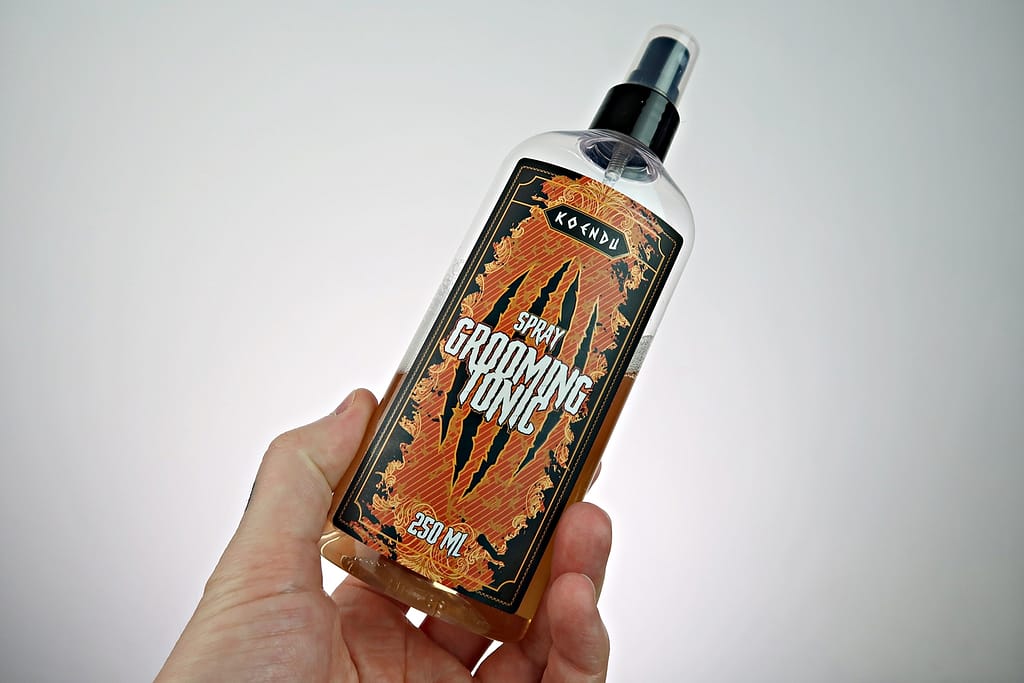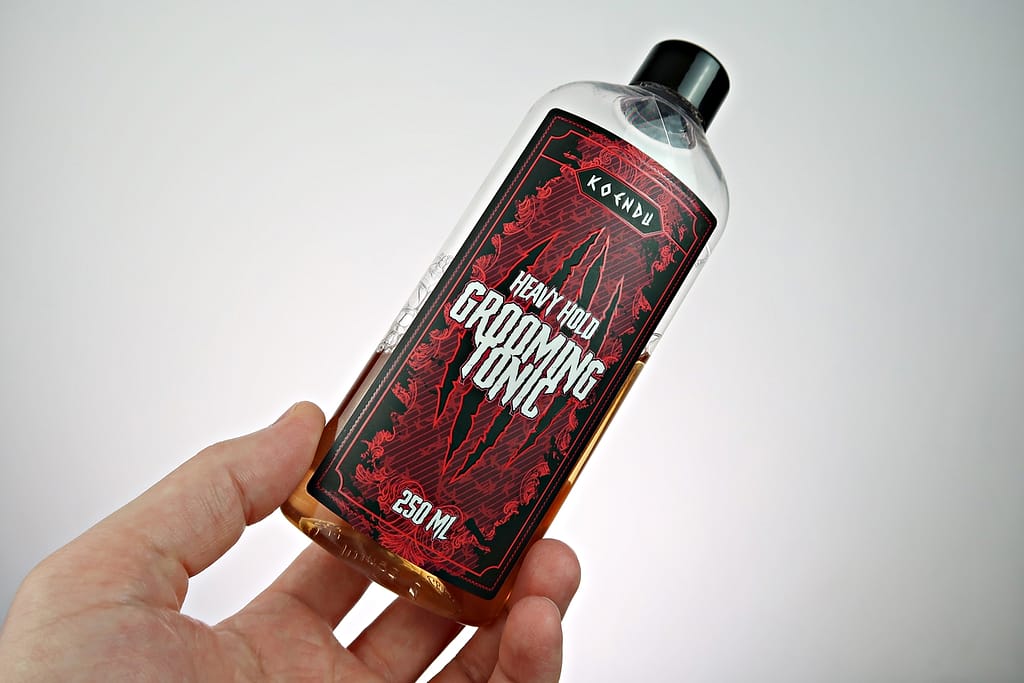 Koendu Grooming Tonic Heavy Hold to mocniejsza wersja poprzednika. Produkt, który ma dodać objętości, mocno utrzymać włosy w ryzach, pogrubić je oraz nadać zdrowy połysk. Opakowanie toniku podobnie jak reszty ma tożsamą etykietę ale w odcieniach czerwieni. To nadal 250 ml mocnego utrwalacza w niemalże pomarańczowym kolorze. Przez to, że tonik jest dużo gęstszy i bardziej lepki niż zwykły Grooming nie ma tu atomizera tylko rozwiązanie znane z marki Reuzel – zatyczka z dziurką po środku, przez którą wylewamy produkt na dłoń. Zapach zbliżony do Grooming Tonic Spray.