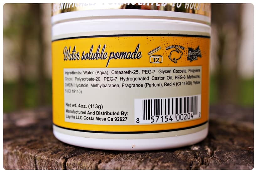 Layrite Original znajduje się w plastikowym pojemniku w kolorze białym marki Taral Plastics. Wieczko zdobi od góry żółta naklejka informująca nas o marce, rodzaju pomady, właściwościach oraz miejscu produkcji. Boczna ścianka wieczka ozdobiona jest złotą taśmą, która informuje o tym, że pomada ma chwyt jak pomady woskowe, ale zmywa się jak żel, czyli łatwo. Ścianki opakowania oklejone są również żółtą banderolą, która oprócz logo marki (kobieta w stylu pin-up z barber pole między nogami) zawierają masę różnych informacji takich jak: opis pomady, skład pomady czy np. informację o tym, że nie była testowana na zwierzętach. Bardzo podoba mi się to stare opakowanie, jest takie klasyczne.