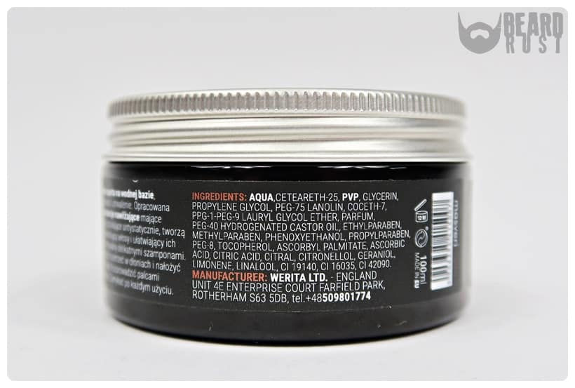 Pomada mieści się w przysadzistej plastikowej puszcze z zakręcanym metalowym wieczkiem. Etykiety są dosyć minimalistyczne, ale bardzo ładne i niezwykle treściwe. Na wieczku znajdziemy logo marki, które osobiście przypomina mi maskę Spartanina bądź też literkę M (od Masveri). Etykieta boczna w czarnym kolorze informuje nas, że jest to produkt do włosów i brody, jest na bazie wody oraz że ma mocny chwyt. Znajdziemy tu też pełny skład produktu i sposób użycia. Wszystko w języku angielskim i polskim.