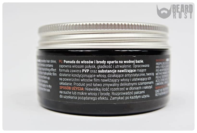 Efekty na brodzie: pomadę nakładałem na brodę kilka razy; nadaje naturalny połysk, ładnie pachnie, przez pewien czas trzyma brodę, ale później wysycha jak na włosach i broda robi się sucha i mało komfortowa; zdecydowanie lepiej sprawdza się na włosach niż brodzie.