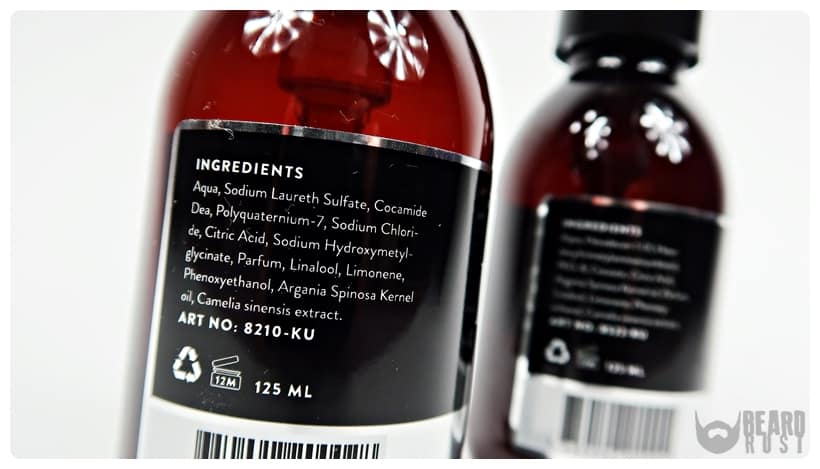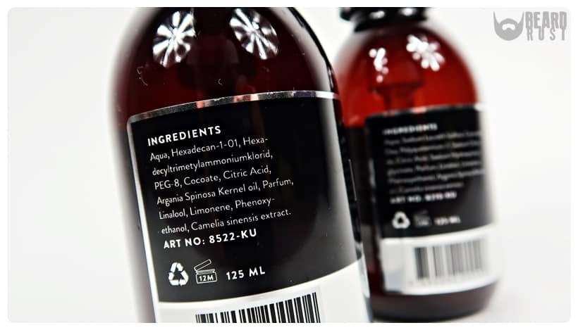 Oba kosmetyki mieszczą się w butelkach wykonanych z ciemnego plastiku o pojemności 125 ml każda. Mają również takie same dozowniki – czarne pompki, które znacznie ułatwiają aplikację szamponu/odżywki. Jedna pompka szamponu to całkiem spora ilość produktu, która akurat na długość mojej brody była idealna. Odżywki aplikowałem dwie pompeczki. Co do designu opakowania i etykiet są one bardzo minimalistyczne – czarna naklejka z białymi napisami oraz srebrny pasek z białą nazwą kosmetyku (na zdjęciach mało widoczna). Po jednej stronie etykiety znajdziemy dane marki oraz krótki opis, a po drugiej skład produktu. Etykiety są odporne na wodę.