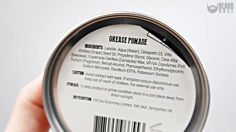 Jak widać głównym składnikiem jest lanolina przez co pomada jest gładka, kremowa oraz wybiera się z łatwością. Woda na miejscu drugim może pomóc nam lepiej zmyć pomadę z włosów. Fajnie, że również na początku znajdziemy pielęgnujący olej z pestek winogron. Później w składzie mamy też woski – pszczeli i karnauba, które zapewne odpowiadają za chwyt produktu.