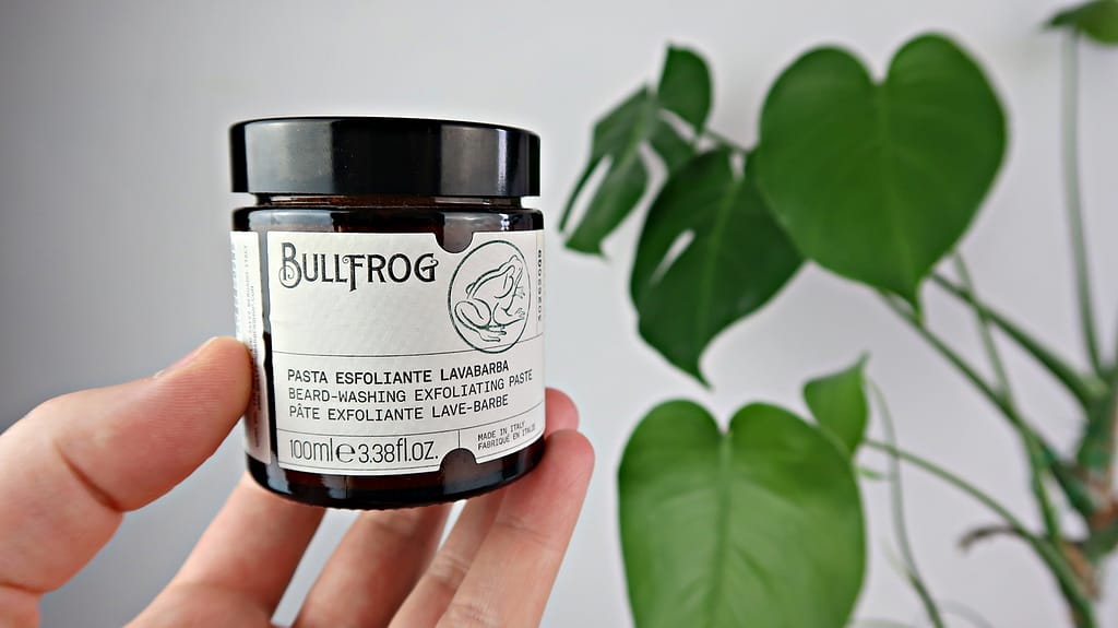 Zostajemy przy peelingach ale przechodzimy do brody. Kolejnym kosmetykiem, który skradł moje serce jest cukrowy peeling Bullfrog do mycia brody. Kosmetyk znajduje się w szklanym słoiku o pojemności 100 ml z równie prostą papierową etykietą. Podoba mi się, że włoski producent tak świadomie podchodzi do kwestii związanych z dbaniem o środowisko. Sam peeling ma piękny żółty kolor, a jego konsystencja przypomina scukrzający się miód. Posiada formułę ze złuszczającymi ziarenkami cukru, które pod wpływem wody zmieniają się w przyjemną pianę. Produkt jest nieziemsko wydajny. Wśród aktywnych składników naturalnych znajdziemy: