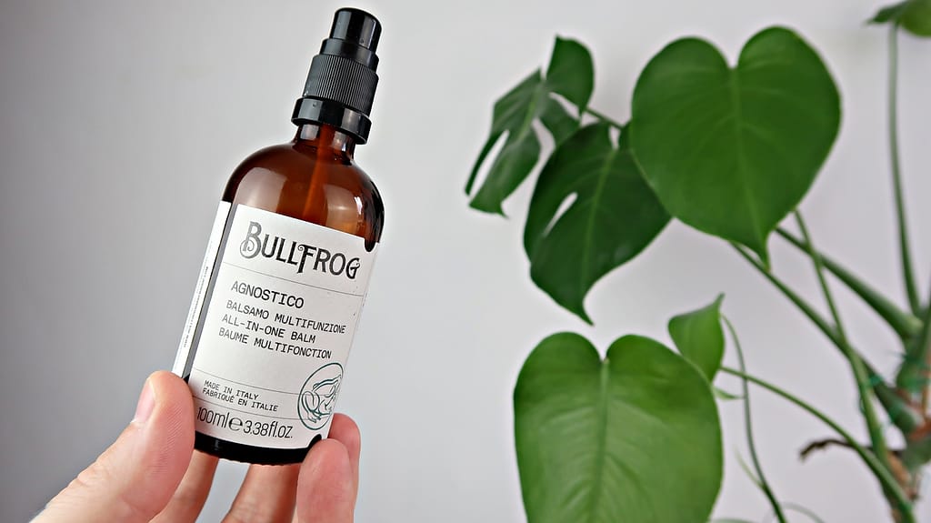 Na koniec produkt, który od lat zajmuje w mojej łazienkowej szafce honorowe miejsce. To multifunkcyjny krem Bullfrog Agnostico. Gdyby mężczyzna miał mieć tylko jeden krem to byłby właśnie ten. Mieści się w szklanej butli o pojemności 100 ml z pompką. Jest beżowy, o lekko płynnej kremowej konsystencji. Rozprowadza się gładko i szybko wchłania. Świetnie nawilża i lekko chłodzi. Pachnie najlepiej bo połączeniem nut anyżu, skóry, tytoniu i bay rum. Można stosować go do twarzy, brody, ciała, tatuażu, po goleniu you name it. Do tego bodajże co roku odświeżana jest jego szata graficzna, tworzona przez zacnych artystów. Więc prócz mega działania wygląda też pięknie na półce. Polecam gorąco.