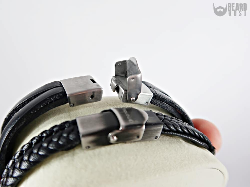 Tak jak wspomniałem wyżej prezent, który otrzymałem w zeszłym roku (aż wstyd, że dopiero o tym piszę) okazał się być dwoma bransoletkami. Pierwsza z nich to męska bransoleta ze skóry z symbolem X. Składa się z 3 połączonych pasków oraz symbolu X umieszczonego po środku. Wg producenta biżuteria ta wykonana jest ze skóry naturalnej oraz stali szlachetnej 316L. Co ważne, jest przyjazna alergikom. Produkt dedykowany dla osób ceniących nowoczesny design z nutą klasyki. Długość paska to 21 cm. Zapięcie następuje poprzez bardzo sprytny zatrzask widoczny na zdjęciu poniżej. Jeśli wasz nadgarstek nie należy do szerokich to nie martwcie się bo po odpięciu klamer z zatrzasków można pasek przyciąć i zapiąć go ponownie.