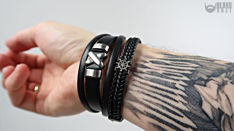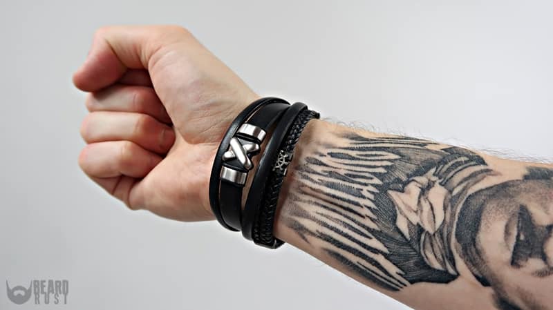 Bransoletki, które widzicie na zdjęciach noszę od momentu, w którym do mnie trafiły prawie codziennie. Z początku musiałem wyregulować ich długość, ale jak wspomniałem wcześniej można poradzić sobie z tym bez problemu w domu. Bransoletki noszę razem na jednej ręce przez co tworzą fajną spójną kompozycję i świetnie podkreślają mój styl. Pasują zarówno do luźniejszego tiszerta jak i do koszuli. Jakość wykonania jest naprawdę wysoka, co mogę potwierdzić po tak długim czasie użytkowania. Bransoletki przeżyły ze mną wiele dobrego i złego. Były obcierane, moczone, miały styczność z pomadami, środkami do dezynfekcji itd (pracuję jako barber). Raczej ich nie oszczędzałem i przyznam, że są solidne. Wiadomym jest, że skóra pracuje i się lekko rozciąga (tu można ponownie wyregulować pasek w razie potrzeby), a elementy stalowe łapią rysy. Mimo tych drobnych wad nabytych biżuteria nadal wygląda nieźle i jakby spojrzeć na to z innej strony dodaje jej to uroku i wintydżowego smaczku.