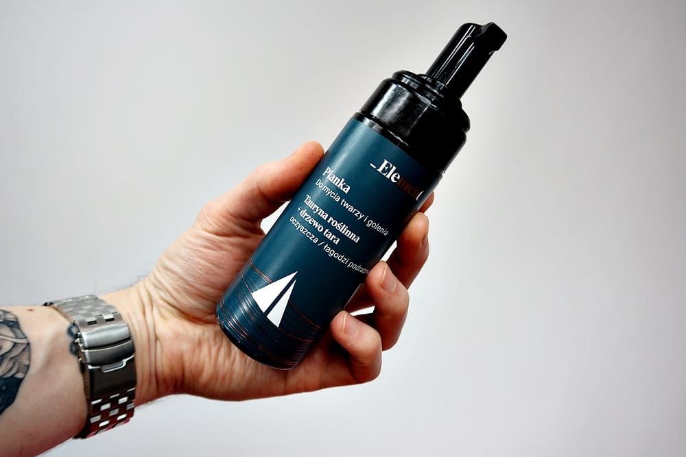 Kolejnym kosmetykiem ze stajni Element jest pianka do mycia i golenia twarzy. I tu od razy powiem, że w moim przypadku do golenia się nie nadaje. Po pierwsze jest zbyt rzadka, a po drugie szybki wysycha wiec golenie z nią jest mało komfortowe. Do mycia twarzy jest natomiast petarda. Pojemnik najpierw trzeba wstrząsnąć, aby potem specjalną pompką wydobyć pianę na zewnątrz. Pianka posiada takie same ekstrakty i wyciągi co szampon. Jest delikatna, świetnie pachnie i myje twarz. Działa na skórę bardzo kojąco. Jest też super wydajna ! Jej cena to 17 zł za 170 ml. Mocno polecam !