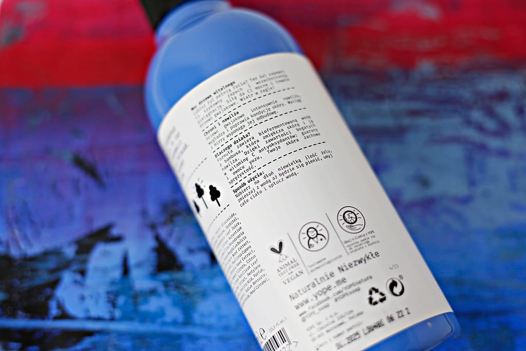 W zestawie Yope, o którym wspomniałem wyżej był też żel pod prysznic o zapachu mirry i tonki. I muszę przyznać, że jest to chyba jak do tej pory mój ulubiony zapach w tego typu kosmetykach. Jest tak przyjemny i relaksujący, że brak mi słów. W tym momencie kończę drugą butelkę. Zapach jest naprawdę intensywny i moim zdaniem bardzo męski. Żel mieści się w niebieskiej butli o pojemności 400 ml z pompką. Świetnie zmywa ze skóry nieczystości i pozostawia ją miłą w dotyku, bez napięcia i poczucia suchości. Żel jest naturalny w 98%, wegański, a biofermentowana woda z bambusa zmiękcza i nawilża skórę. Dodatkowo witamina C, guarana, owoc yuzu nadają sprężystości. Polecam cieplutko. Za ww pojemność zapłacimy ok 24 zł, a żel jest bardzo wydajny.