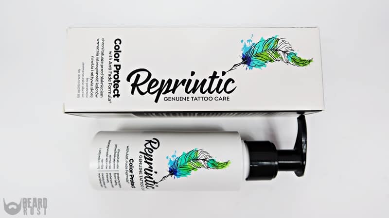 Reprintic Color Protect to krem ochronny do codziennej pielęgnacji tatuaży. Jego zakup również był spontaniczny jako że skończyłem używać masło od Loveink, sięgnąłem w aptece po pudełko z kolorowym piórkiem (obrazek mnie przyciągnął). Nie mam na skórze kolorowych dziar, ale czarny to w sumie też kolor, więc używałem kremu codziennie przez jakiś czas aby sprawdzić jego działanie na skórę i dziaby. Krem dozujemy za pomocą funkcjonalnej pompki (plus za opcję open-stop). Jest kremowy, łatwo się rozciera, bez oporu i nawet ładnie się wchłania… Zapach delikatny, kosmetyczny. W składzie znajdziemy witaminy A i E, sok z drzewa smocza krew, mix olejów lnianego, monoi i z pestek róży. Nie do końca potrafię określić czy zauważyłem różnicę w intensywności barwy moich tatuaży, ale na pewno ich stan się nie pogorszył. Stosowałem już kilka produktów do pielęgnacji dziar i jedyna rzecz jaka mi przeszkadzała, podobnie jak w przypadku produktów od Easy Tattoo (nie, o nich nie pisałem na blogu), to fakt iż krem czasami dziwnie wysychał na skórze i jakby się kruszył, przez co uczucie nawilżenia skóry znikało bardzo szybko. Niby nie jest zły, ale miałem okazję używać lepszych. Tak czy siak za tubę z pompką o pojemności 100 ml zapłacimy średnio 20-30 zł.