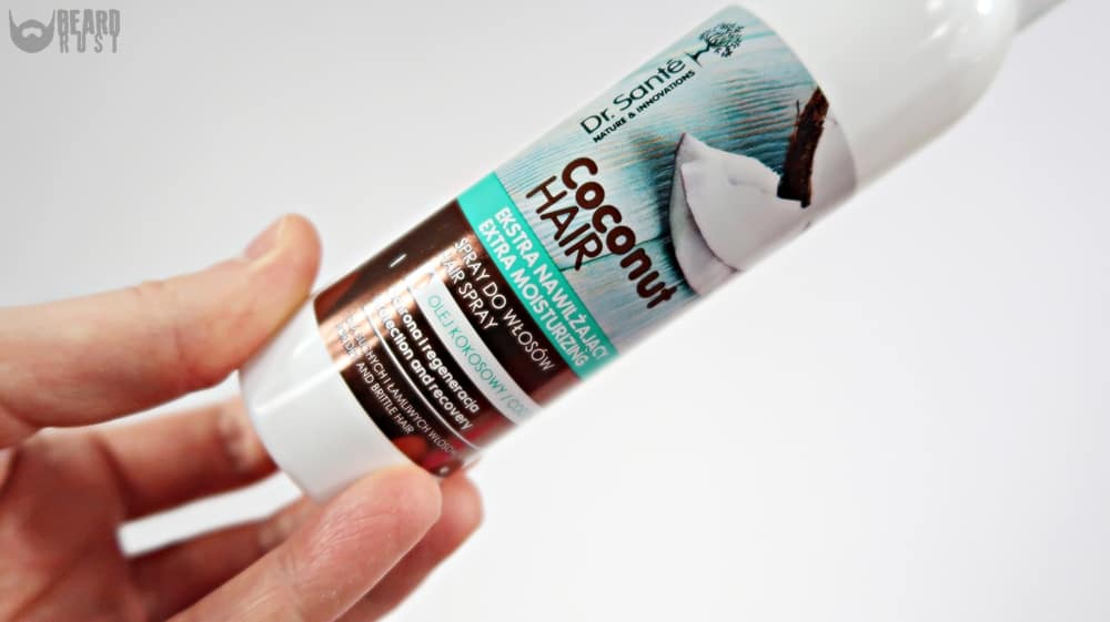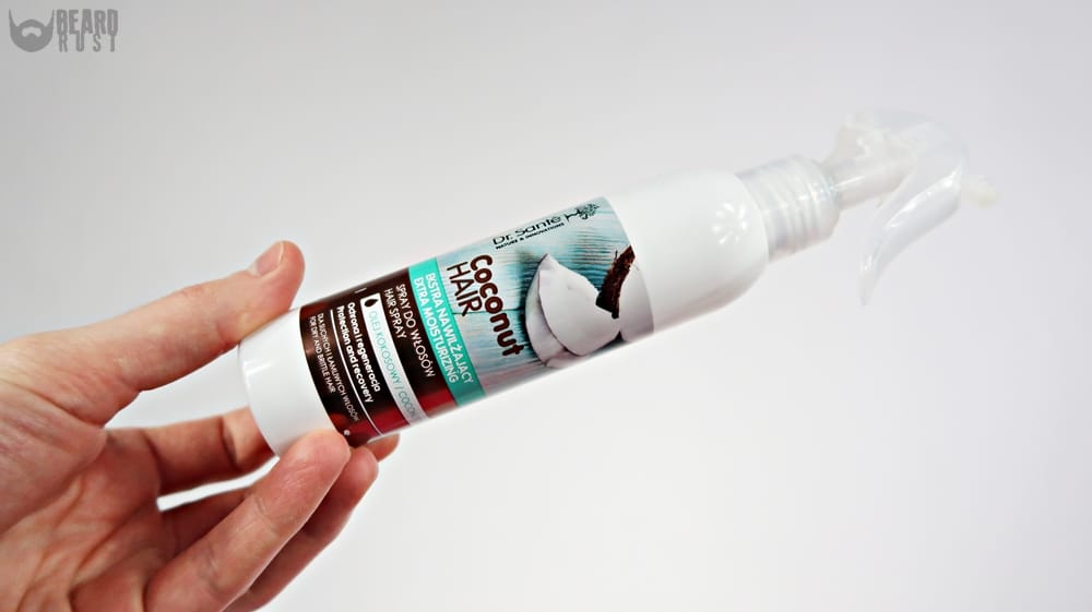 Jak dotąd marka Dr. Sante nic mi nie mówiła i pewnie jakby ktoś się mnie o nią zapytał powiedział bym, że to ta produkująca ryże, kotlety sojowe i ciastka. Kiedy skończyła mi się moja obecna odżywka do włosów, szukałem jakiejś alternatywy. Padło na niezbyt drogą odżywkę w sprayu. Nigdy takowych nie używałem więc stwierdziłem, że może być ciekawie potem to dla was opisać. Odżywka w sprayu Coconut Hair to extra nawilżający sprawy do włosów, który ma ochronić nasze włosy i zregenerować je. Polecany jest do włosów suchych i łamliwych. Głównym sprawcą tych cudów ma być olej kokosowy, który jak wiemy potrafi zdziałać dużo dobrego. W składzie również takie substancje jak: hydrolizowane białka pszenicy, amino kwasy z pszenicy i soi, arginina, seryna, kwas mlekowy itd.
