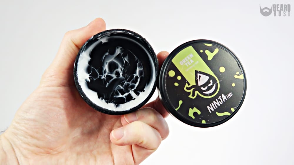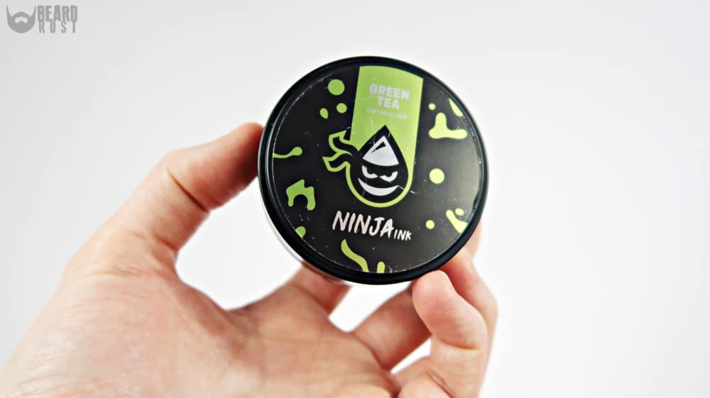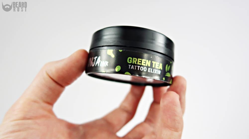 Jeśli chodzi o gojenie tatuażu to wg mnie do tej pory nie spotkałem lepszych produktów niż Ink-Lab. Ostatnimi czasy jednak moją uwagę przykuł brand, który stworzył kremy do codziennej pielęgnacji. A że akurat takowy krem mi się skończył postanowiłem zaryzykować i spróbować czegoś nowego. Marka Ninja Ink ma w swojej ofercie dwa elixiry, które służą do codziennego użytku. Są dwie wersje zapachowe – Watermelon (arbuz) oraz Green Tea (zielona herbata) i na ten drugi zapach postawiłem. Kremy wychodzą w dwóch pojemnościach 50 ml oraz 100 ml. Opakowania z pewnością przykuwają oko – są plastikowe, w pełni czarne i ozdobione kolorowymi etykietami. Na wieczku widnieje logo marki czyli kropla tuszu w stroju ninja. Są tu też metaliczne wstawki, które błyszczą się to na zielono to na żółto w zależności od kąta padania światła. Przyznam, że ładnie się to prezentuje. Niestety podczas używania etykietki się wycierają co widać na fotkach.