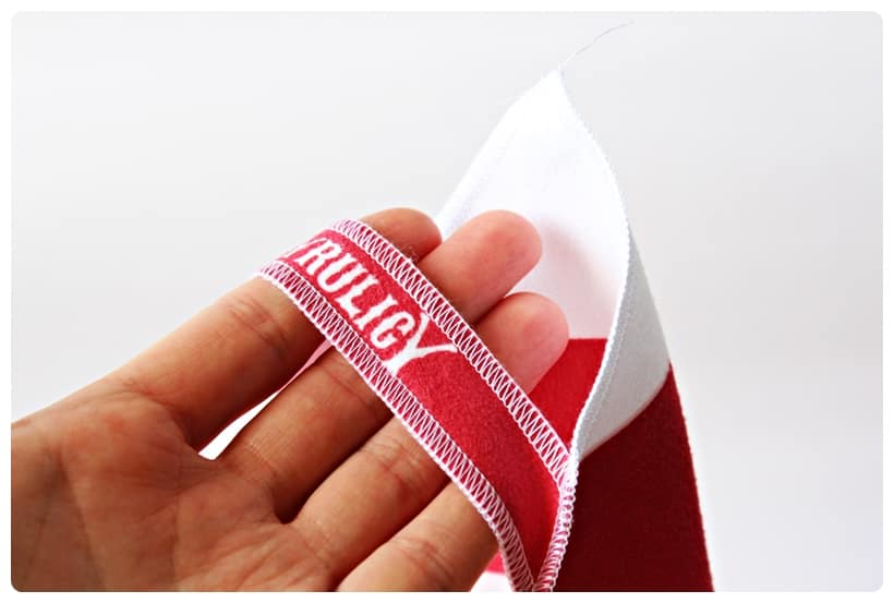 Co więcej, brzegi ręcznika są pięknie obszyte tak aby się nie pruł. W jednym z rogów widnieje logo marki, a po drugiej stronie w przeciwległym roku znajduje się specjalny pasek z napisem Cyrulicy, za który możecie powiesić ręcznik.