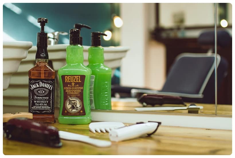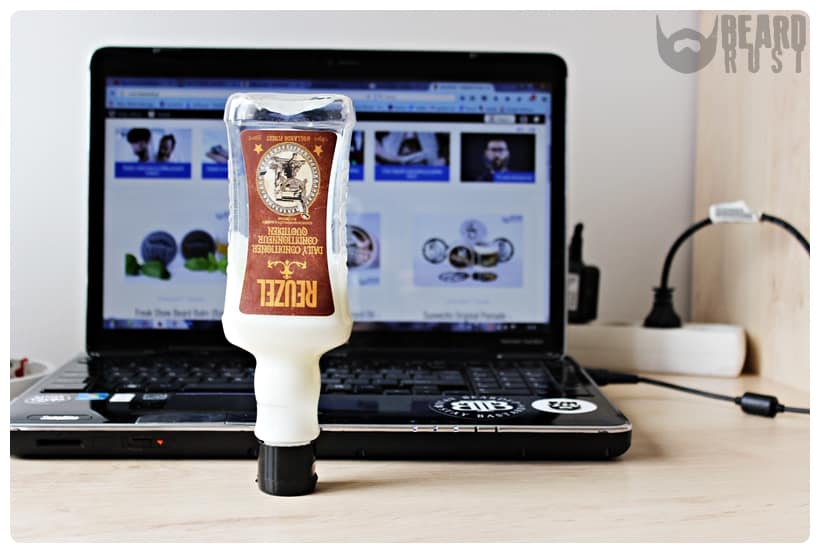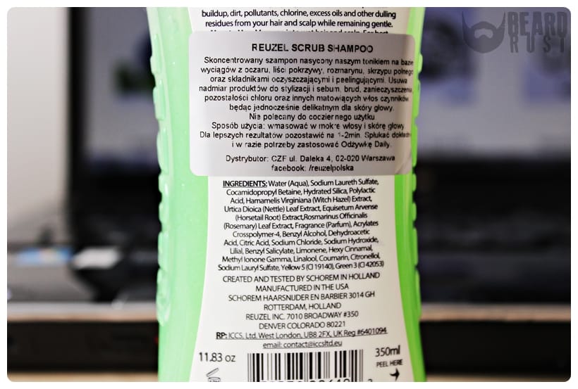 Szampon Reuzel Scrub występuje w takim samym plastikowym opakowaniu co choćby Grooming Tonic. Butelka jest fajnie wyprofilowana i dobrze leży w dłoni. Ma czarną zakrętkę z otworem, przez który aplikujemy produkt. Boczne ścianki opakowania mają wytłoczone logo producenta (swego rodzaju wypustka), która jednocześnie poprawia chwyt butelki nawet przy wilgotnych dłoniach. Z przodu brązowa etykieta z wizerunkiem fotela barberskiego oraz podstawowymi informacjami na temat szamponu Scrub. Z tyłu naklejka informująca o składzie i sposobie użycia.