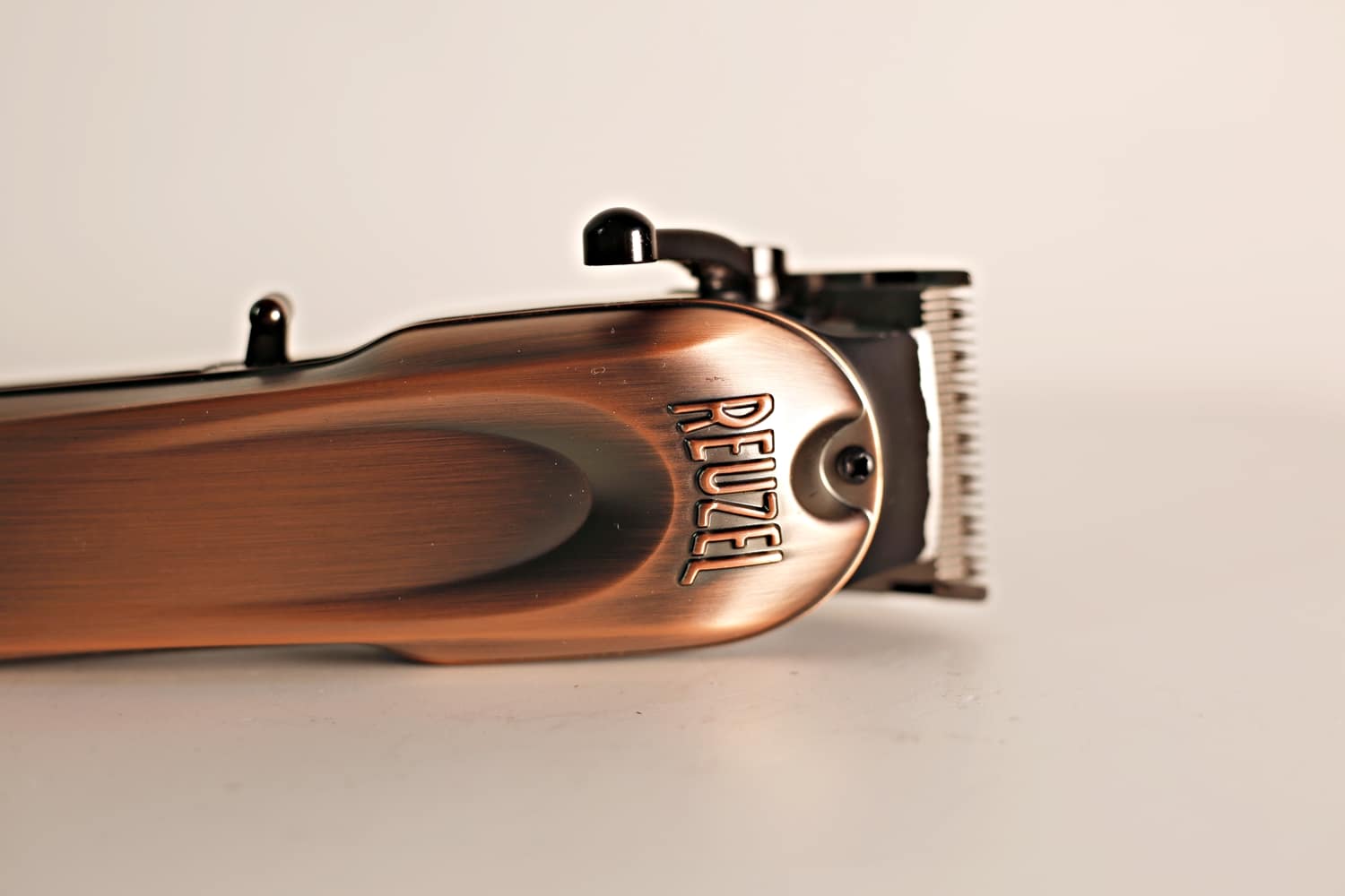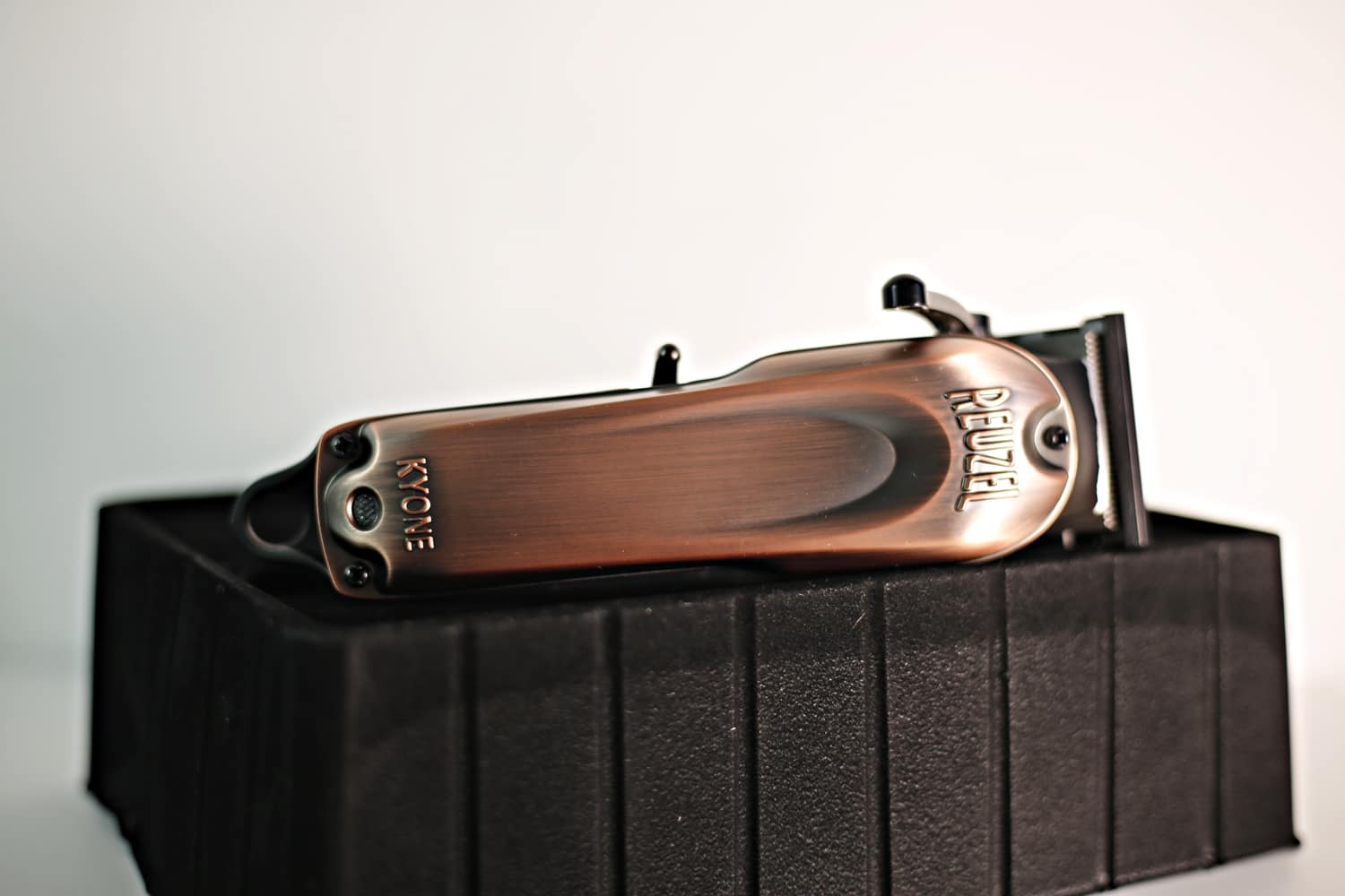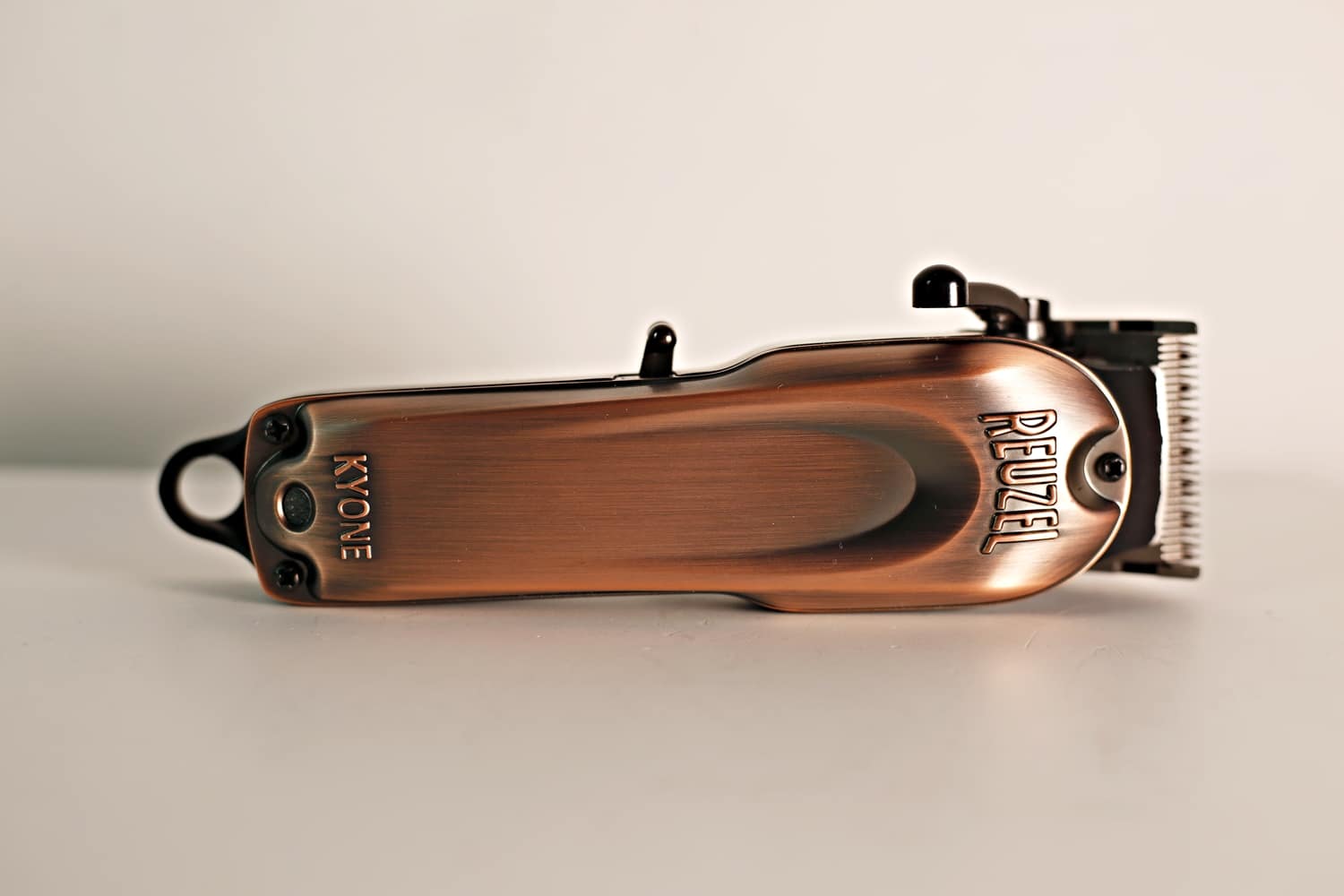 Maszynka z wyglądu przypomina trochę Wahl Seniora z tej metalowej edycji – mamy podobny kształt obudowy, wajhę czy włącznik. Dolna pokrywa jest wyprofilowana jak Wahl Magic Clip/Senior. Górna natomiast ma bardzo fajne wgłębienie na kciuk czego Seniorowi brakuje. Maszynka Reuzel wykonana jest w pełni z metalu – zarówno górna jak i dolna część obudowy to solidny kawał metalu. Górna część jest miedziana z ładnym szczotkowaniem i wytłoczonymi napisami Reuzel i Kyone. Dolna część pokryta jest dodatkowo jakimś tworzywem a la guma lub jakąś satynową farbą typu soft feel przez co pewnie leży w dłoni i nie zostają na niej ślady palców. Maszyna jest ciężka bo waży 414 g (dla porównania Senior waży 370 g, Magic Clip waży 297 g, a SC Rebel 273 g). Jest to chyba najcięższa maszynka z jaką się spotkałem natomiast jeśli ktoś lubi cięższe sprzęty i sporo pracował na Seniorze to nie odczuje dużej różnicy. Mi osobiście ta waga nie przeszkadza, a jej zaletą jest to że fajnie dociska maszynę do głowy klienta.