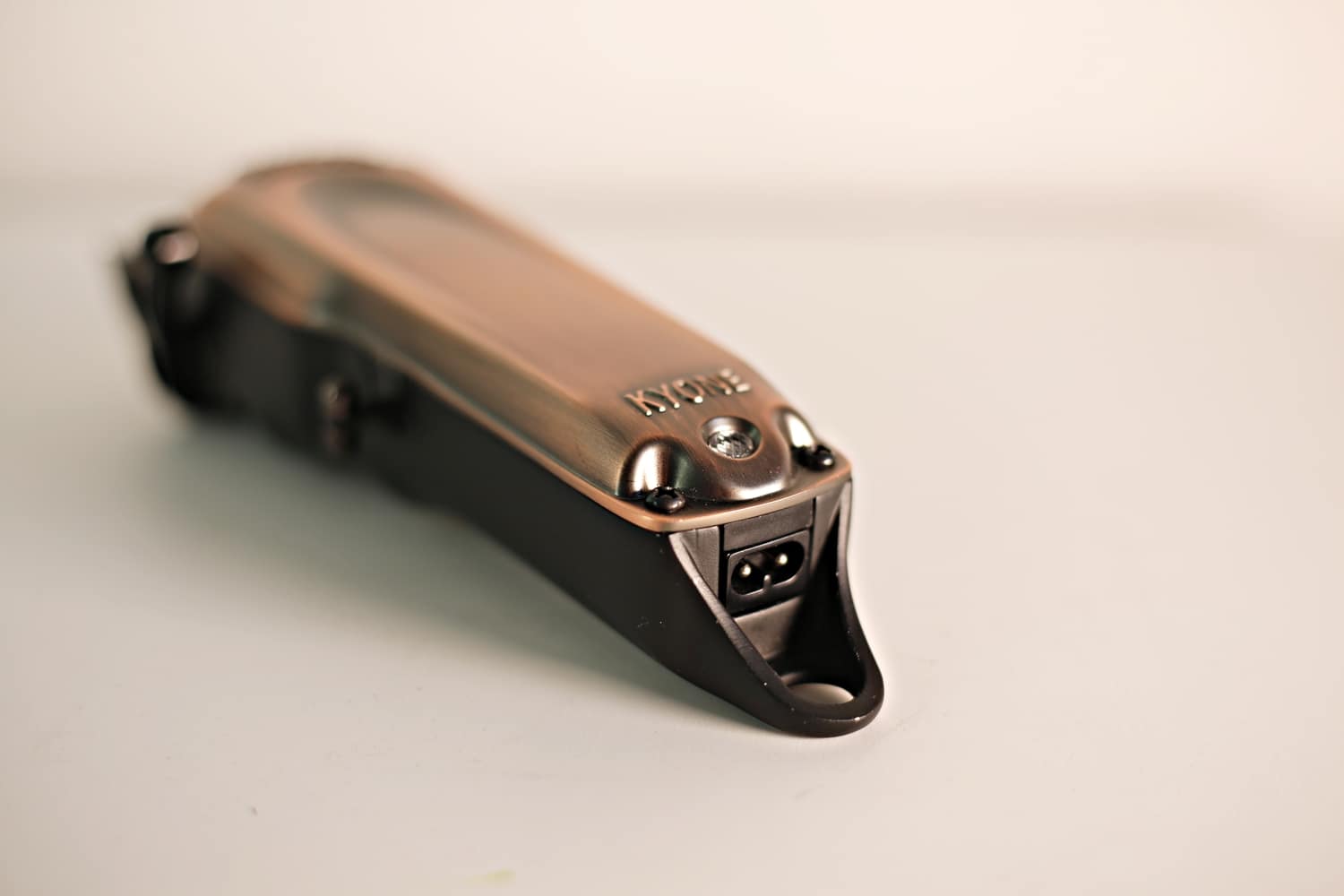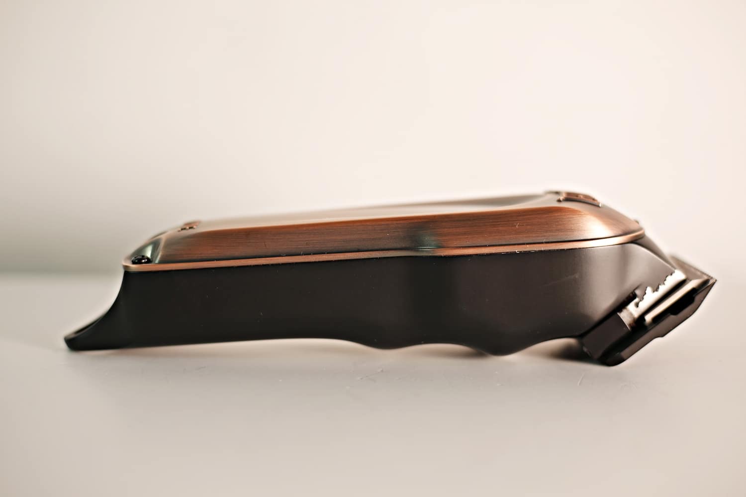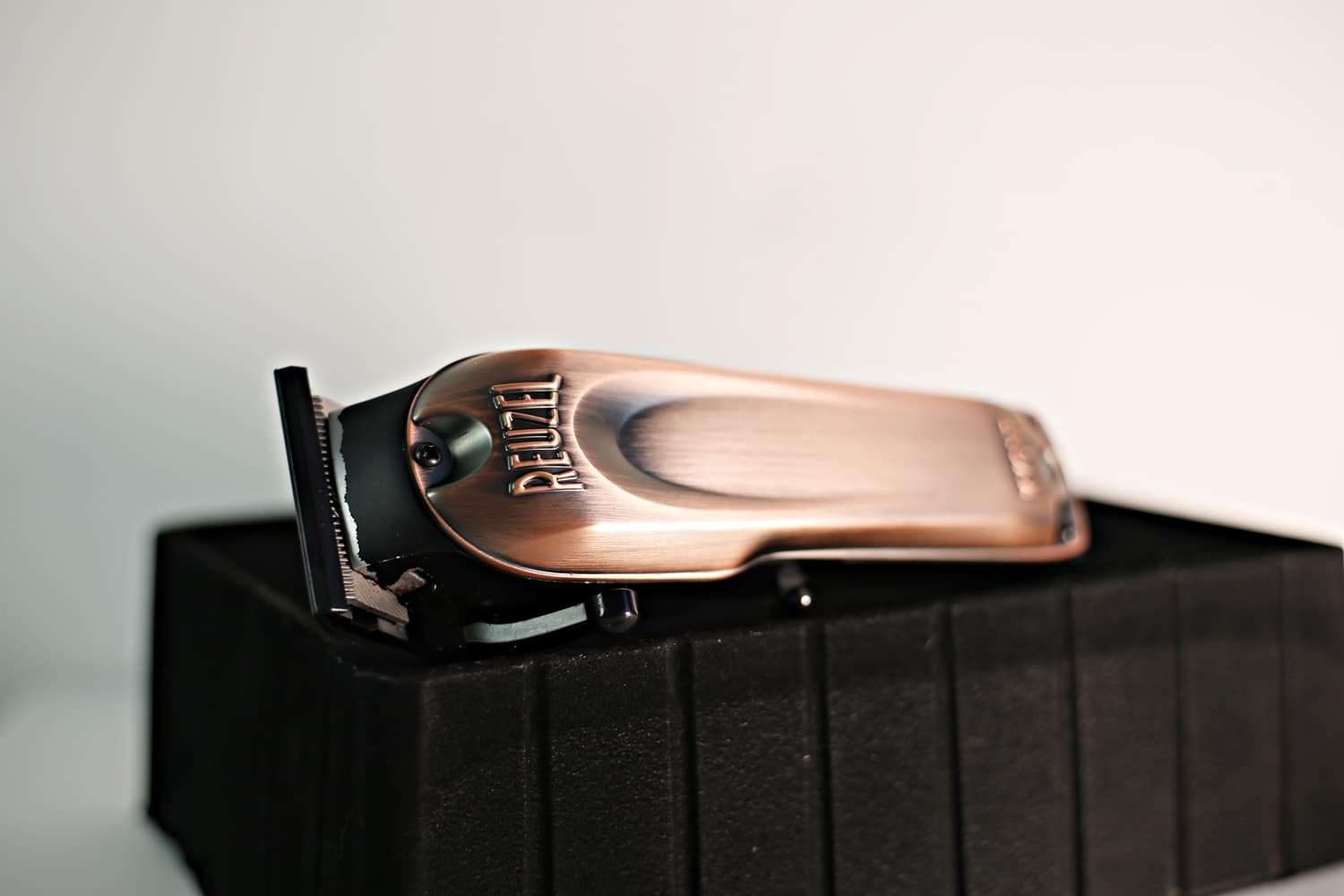 Maszynka z wyglądu przypomina trochę Wahl Seniora z tej metalowej edycji – mamy podobny kształt obudowy, wajhę czy włącznik. Dolna pokrywa jest wyprofilowana jak Wahl Magic Clip/Senior. Górna natomiast ma bardzo fajne wgłębienie na kciuk czego Seniorowi brakuje. Maszynka Reuzel wykonana jest w pełni z metalu – zarówno górna jak i dolna część obudowy to solidny kawał metalu. Górna część jest miedziana z ładnym szczotkowaniem i wytłoczonymi napisami Reuzel i Kyone. Dolna część pokryta jest dodatkowo jakimś tworzywem a la guma lub jakąś satynową farbą typu soft feel przez co pewnie leży w dłoni i nie zostają na niej ślady palców. Maszyna jest ciężka bo waży 414 g (dla porównania Senior waży 370 g, Magic Clip waży 297 g, a SC Rebel 273 g). Jest to chyba najcięższa maszynka z jaką się spotkałem natomiast jeśli ktoś lubi cięższe sprzęty i sporo pracował na Seniorze to nie odczuje dużej różnicy. Mi osobiście ta waga nie przeszkadza, a jej zaletą jest to że fajnie dociska maszynę do głowy klienta.