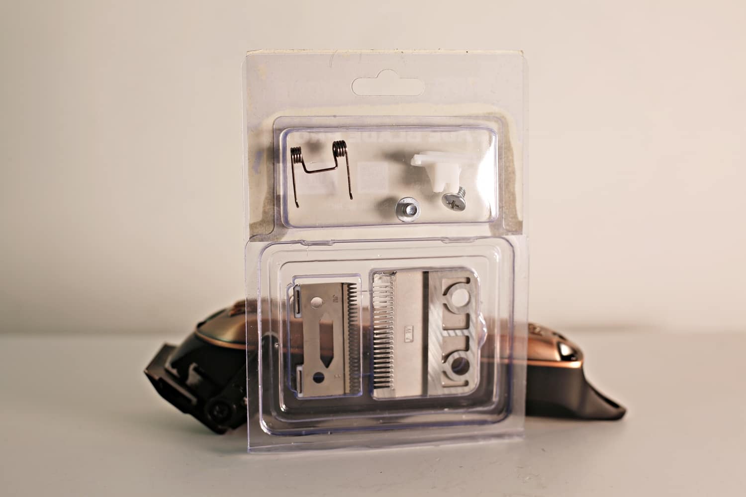 • stopę do fade’a wraz z ostrzem (na maszynce jest taper) i sprężynką, dociskiem i śrubami (żeby każdy producent dodawał te akcesoria to świat byłby piękny – tutaj duży szacun dla marki Kyone)