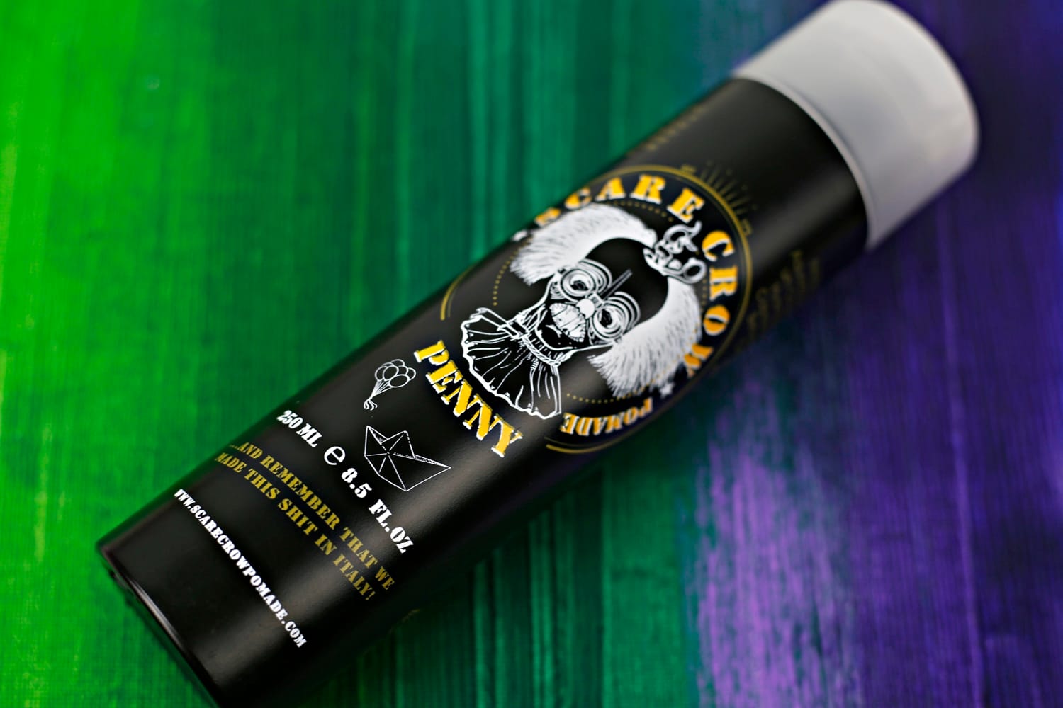 Zaczniemy jak zwykle od opakowania. W przypadku prestylera Penny mamy do czynienia z solidną, czarną plastikową tubą o pojemności 250 ml. Znajdziemy tu info o składzie produktu, sposobie użycia itd. W centrum znajduje się strach na wróble stylizowany na postać klauna Pennywise z horroru TO (stąd też nazwa Penny). Jeśli dobrze się przyjrzycie to na opakowaniu widoczne są też baloniki – charakterystyczne akcesorium klauna z filmu oraz małe papierowe łódeczki nawiązujące do momentu z filmu kiedy właśnie taka papierowa łódka wpada chłopcu do kanału, w którym kryje się klaun. I choć cały ten motyw oraz nawiązanie do filmu nie ma większego związku z samym produktem to jest to fajny akcent. No chyba, że na tym produkcie uda nam się wyczesać taką fryzurę jak miał Pennywise?