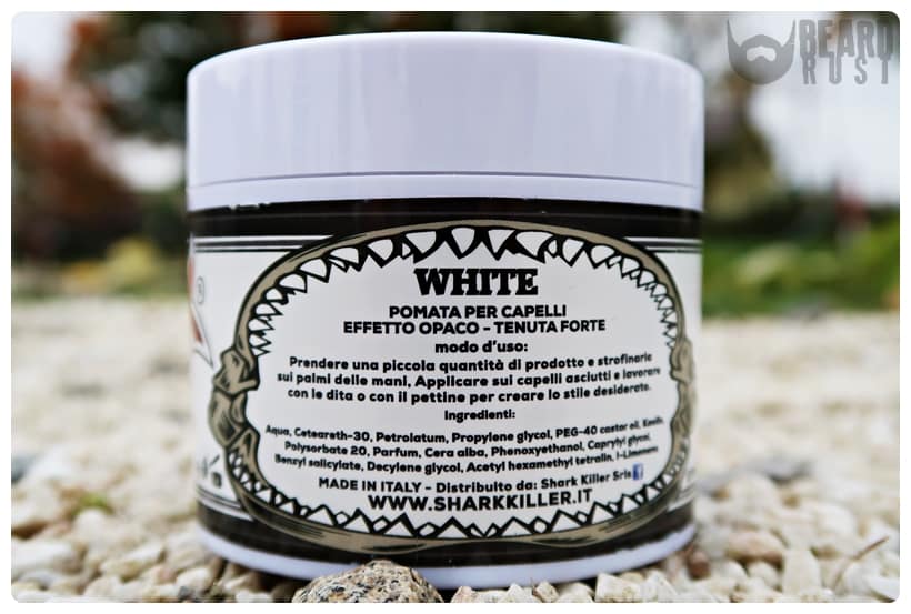 Jeśli chodzi o skład pasty Shark Killer White to jest zdecydowanie krótszy i mniej skomplikowany niż Suavecito Matte. Wodna baza pozwala na łatwe i bezproblemowe zmywanie produktu. Ta sama woda sprawia również, że pomada lekko zasycha, ale o tym później.