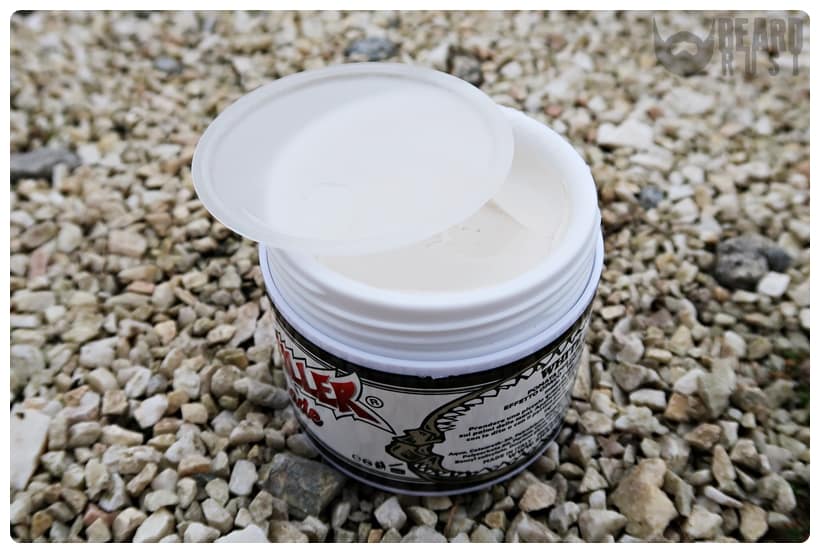 Opakowanie to plastikowa puszka, aczkolwiek wydaje się być twardsza, solidniejsza i wytrzymalsza niż plastik Suavecito czy Layrite. Puszka jest w białym kolorze, a zdobią ją białe etykiety. Dookoła puszki biegnie etykieta, na której znajdziemy logo marki oraz skład i sposób użycia produktu. Wszystko otoczone szczękami rekina. Na wieczku znajdziemy szkielet rekina. Tu przypomina mi się wieczko pomad Suavecito, które też obrazuje szkielet tylko ludzki. Jest tu też adres strony www oraz nazwa pomady – White. Co ciekawe, po odkręceniu wieczka znajdziemy dodatkową nakładkę zabezpieczającą pomadę przed… wszystkim. Całkiem ciekawy dodatek.