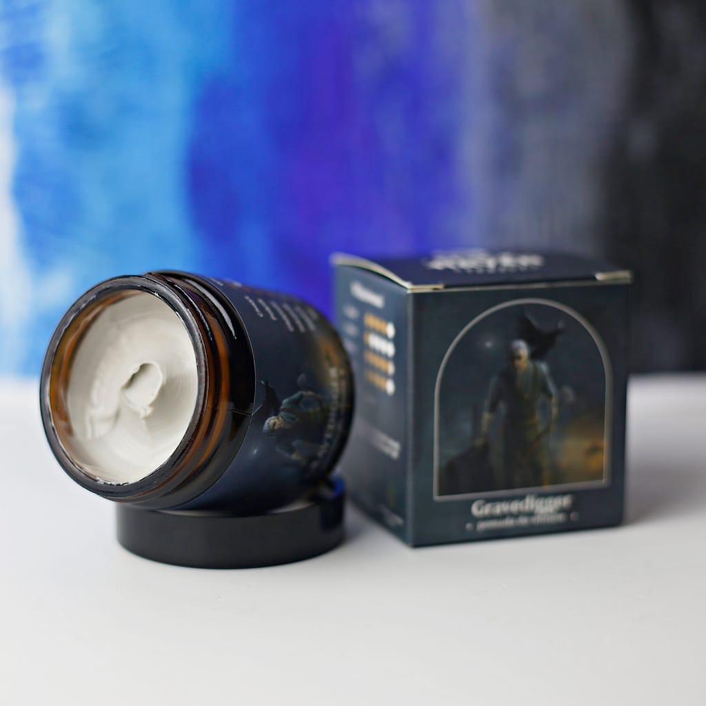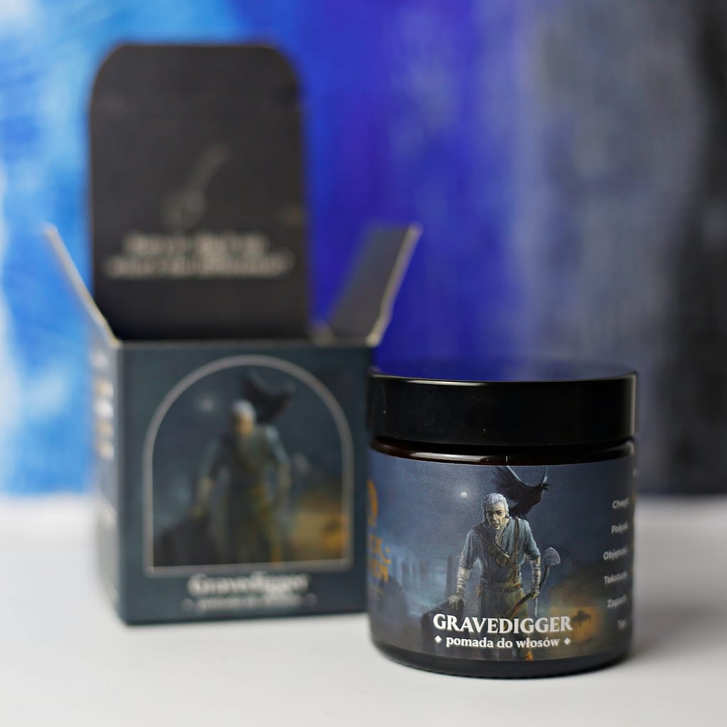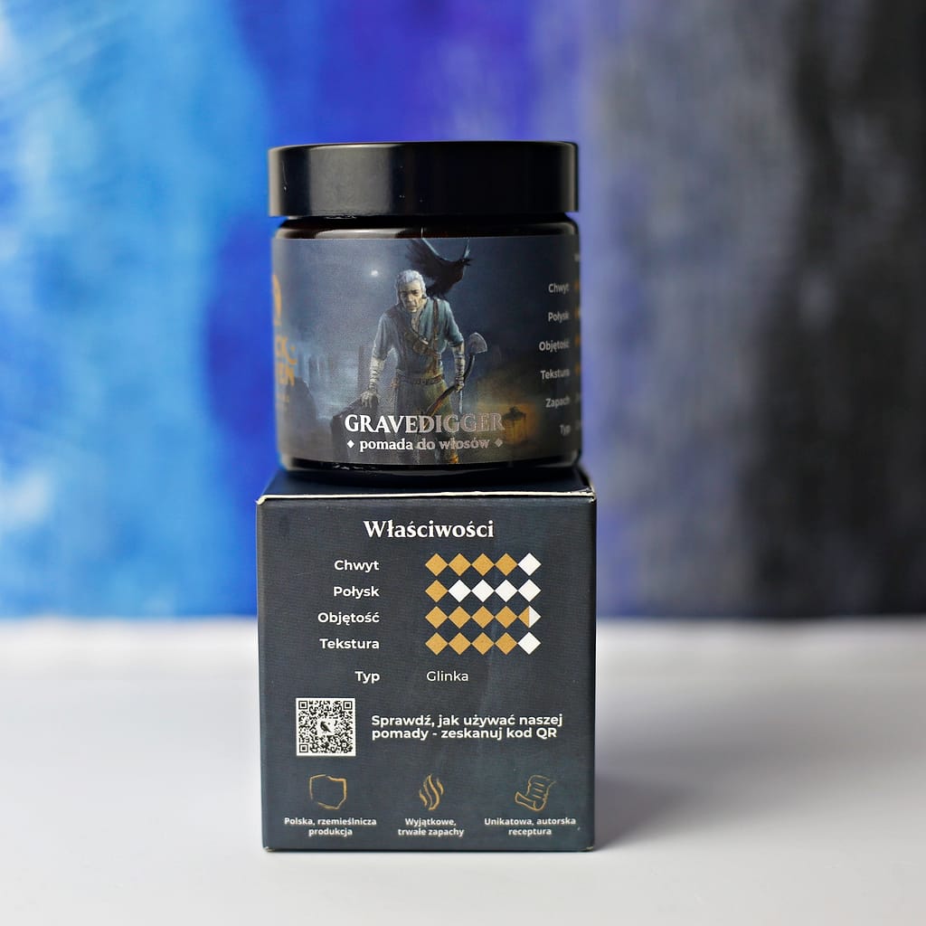 Gravedigger to matowa glinka do włosów mająca zapewnić nam mocny chwyt 4/5, dużą objętość 4,5/5 i teksturę 4/5 przy najbardziej matowym wykończeniu 1/5. Pomada zapakowana jest w gustowny kartonik i mieści się w szklanym słoiku z ciemną etykietą przedstawiającą tytułowego grabarza. Prócz niego znajdziemy tu info o właściwościach glinki, składzie i sposobie użycia.