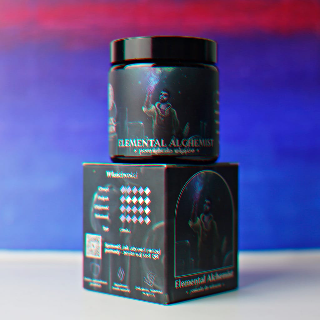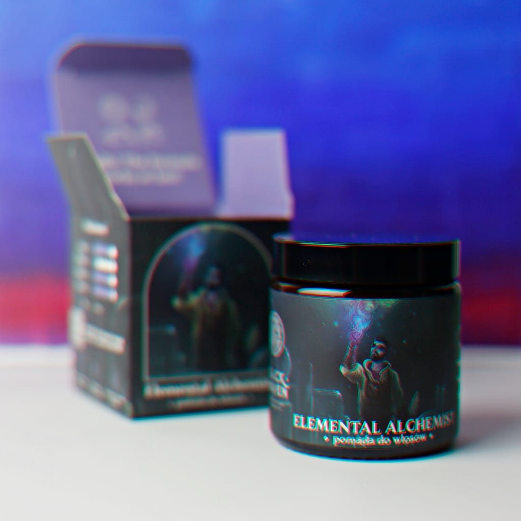 Elemental Alchemist to również glinka do włosów lecz stworzona we współpracy z inną polską marką, którą również lubię i cenię, czyli By Elementum. Pomada ta ma zapewnić nam chwyt mocny 4/5, objętość 4/5, teksturę 4,5/5 i matowy finisz 1/5. Jak pewnie zauważyliście parametry ma podobne ale są pewne różnice. Opakowanie tej glinki również kręci się w nieco mroczniejszych, alchemicznych klimatach. Etykieta przedstawia alchemika który eksperymentuje z różnymi eliksirami. Tutaj też multum informacji o samym produkcie.