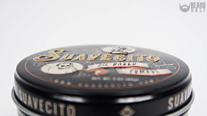 Pewnie każdy z was wie w jakich pudełkach sprzedawane są wodne pomady Suavecito – zwykły, plastikowy pojemnik raczej bez szału (no może poza etykietą bo te są całkiem ładne i wymyślne). W przypadku wosku, Suavecito postarało się bardziej bo ten mieści się w przepięknej, metalowej puszce z tłoczonym logo. Pucha jest ciemnogranatowa, prawie czarna. Całe wieczko ma kapitalne przetłoczenia, a stylistyka napisów nawiązuje do starych, klasycznych pomad woskowych.