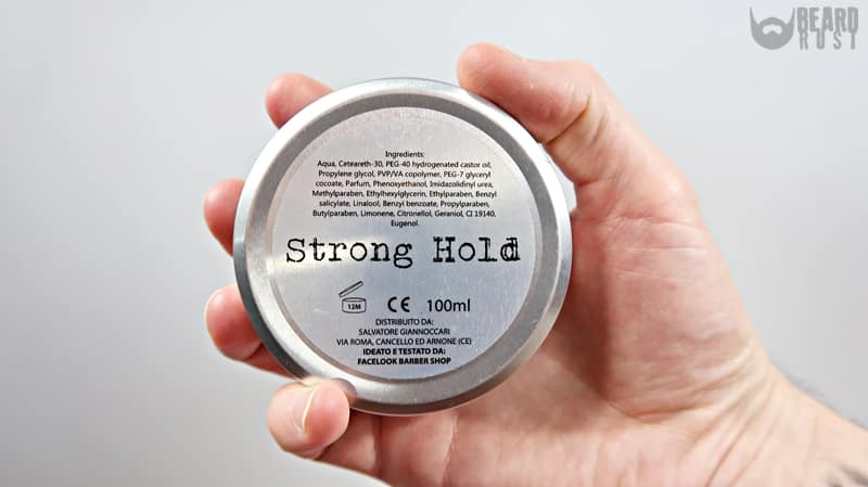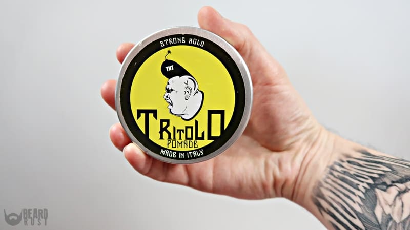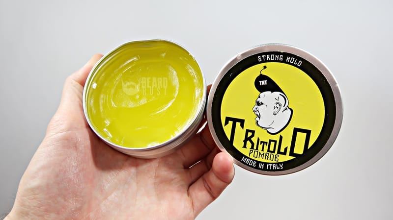 Pomada ma raczej prosty design, można by rzecz przeciętny. Opakowanie stanowi aluminiowa puszka z zakręcanym wieczkiem. Na nim żółto-czarna etykieta z dziwnym pucołowatym gostkiem z psycho quiffem na głowie i dziabem brzytwy nad uchem. Początkowo myślałem, że to jakiś randomowy clip art. Dopiero niedawno dowiedziałem się, że jest to najprawdopodobniej podobizna wokalisty niemieckiego zespołu Mad Sin, który gra wybuchową muzykę w stylu psychobilly. I wszystko jasne – Tritilo – TNT – dynamit – wybuchy itd. Jest grubo. Na odwrocie info o składzie pomady.
